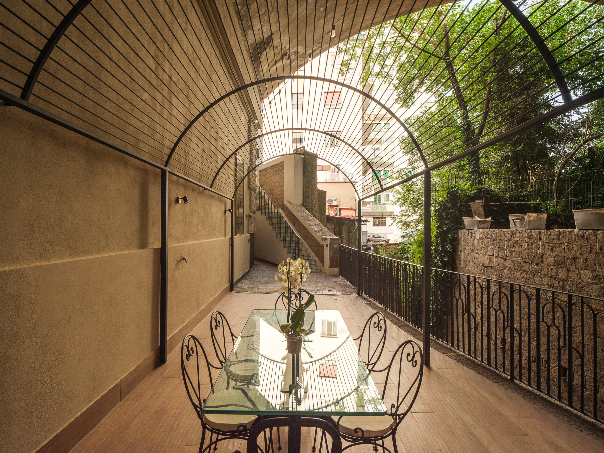 Gli spazi aperti, ricavati negli interstizi del costruito, assumono un ruolo centrale: terrazze, corti e affacci diventano luoghi di relazione e contemplazione, offrendo viste inedite sulla città e sul paesaggio. In questo modo il progetto non solo recupera un manufatto abbandonato, ma restituisce alla collettività una porzione di spazio urbano, valorizzando il sistema delle scalinate come infrastruttura sociale oltre che fisica. Le Residenze Napoletane si configurano dunque come un intervento che unisce rigenerazione urbana e ricerca architettonica, capace di reinterpretare in chiave contemporanea i caratteri identitari di Napoli. L’architettura diventa qui strumento di connessione, un dispositivo che ricuce frammenti della città e li trasforma in un’esperienza abitativa e urbana allo stesso tempo.