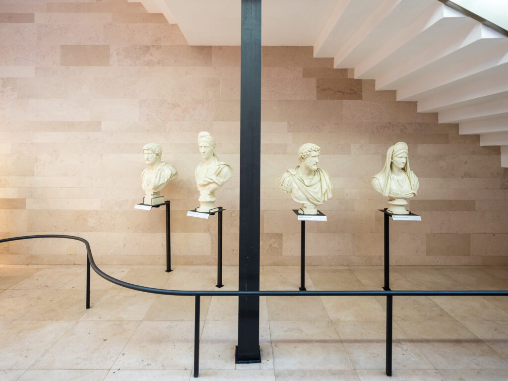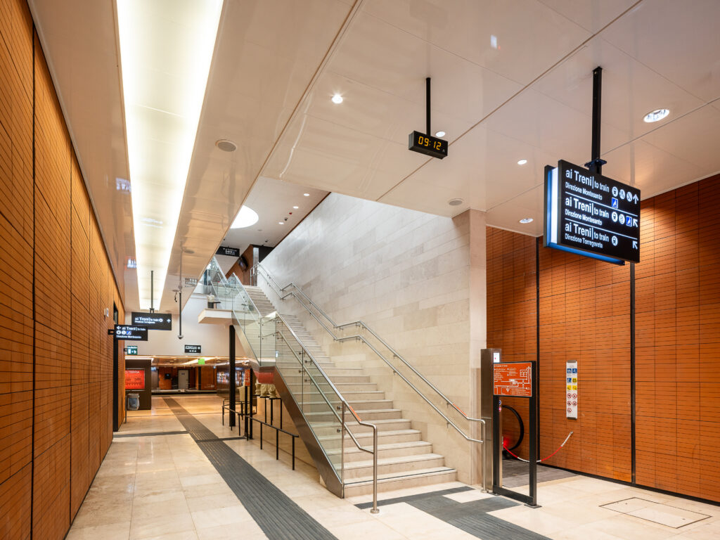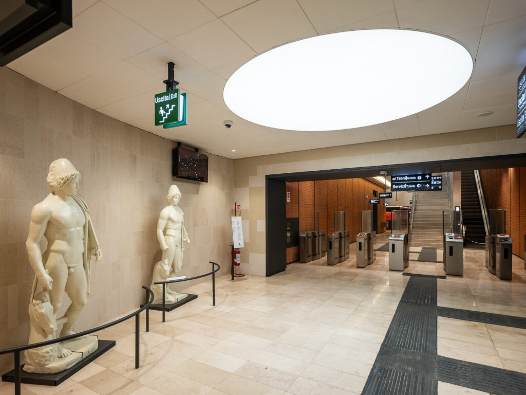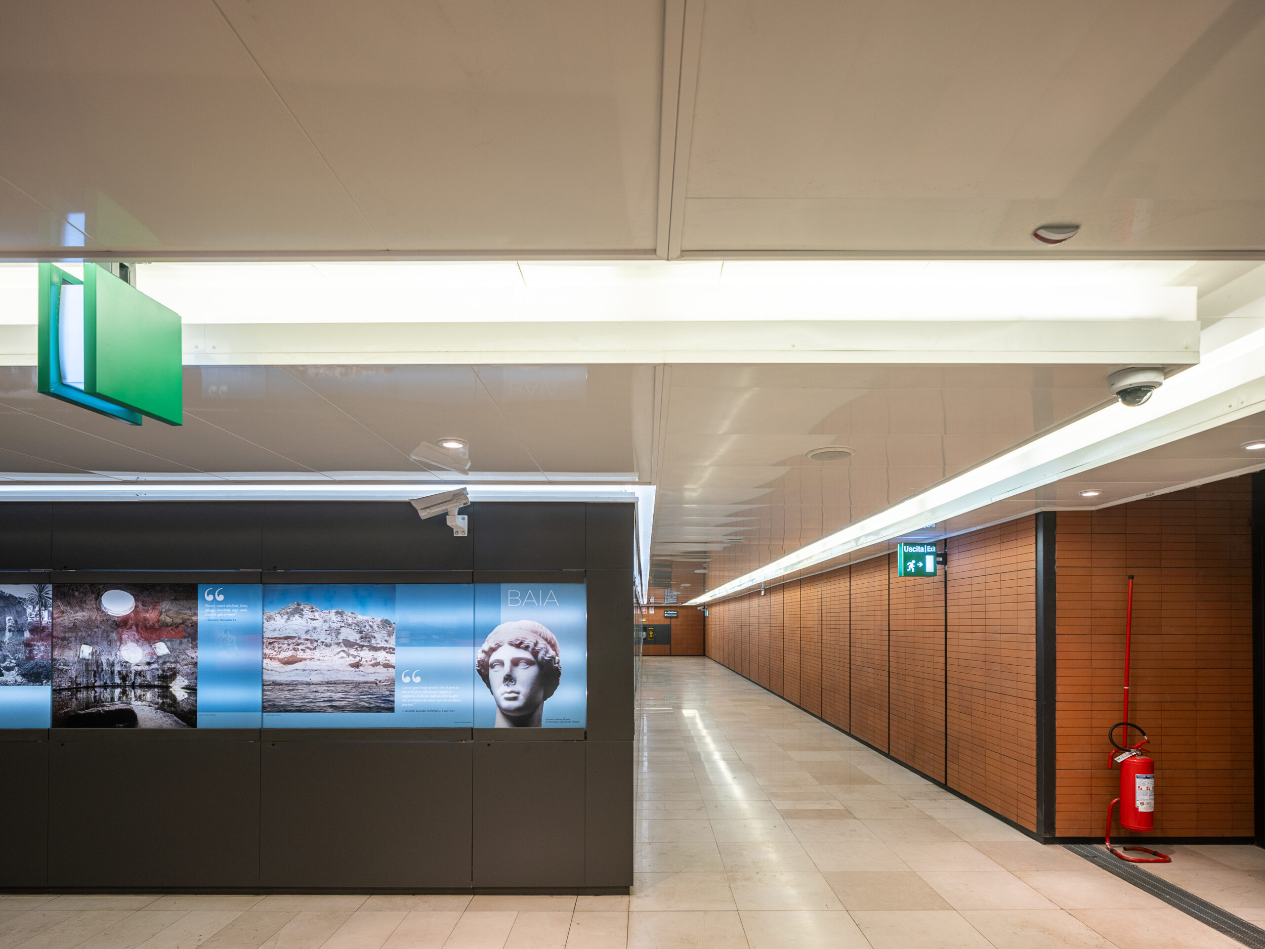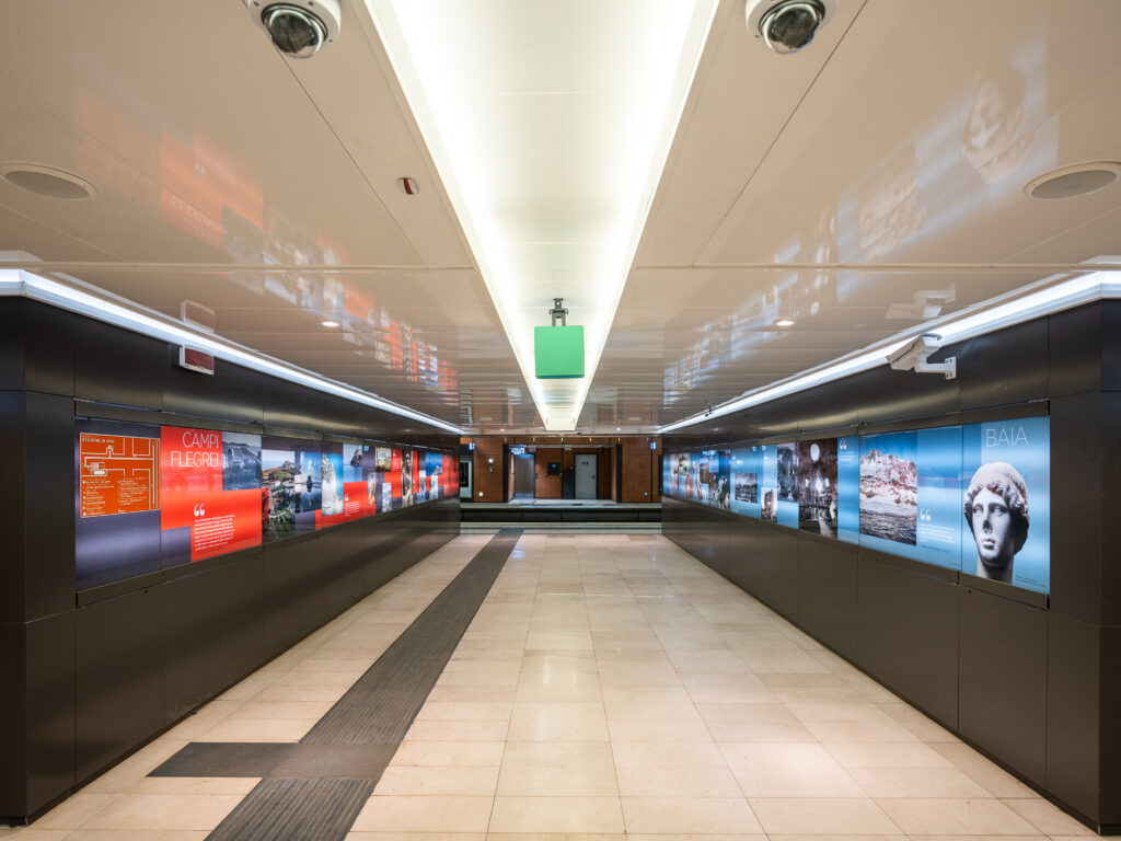La stazione non è concepita come un semplice luogo di transito, ma come uno spazio urbano interno, capace di offrire qualità ambientale e senso di appartenenza. Gli ambienti diventano luoghi da vivere, in cui il viaggio si arricchisce di contenuti culturali. Particolarmente significativo è l’allestimento interno, che trasforma le pareti in superfici narrative: pannelli retroilluminati, mappe, grafici e riproduzioni tridimensionali raccontano la storia di Baia e dei Campi Flegrei, contribuendo a rafforzare l’identità del luogo e il legame con il contesto.