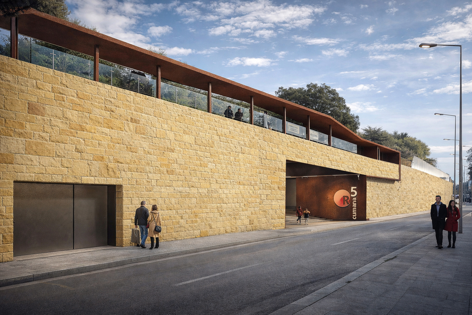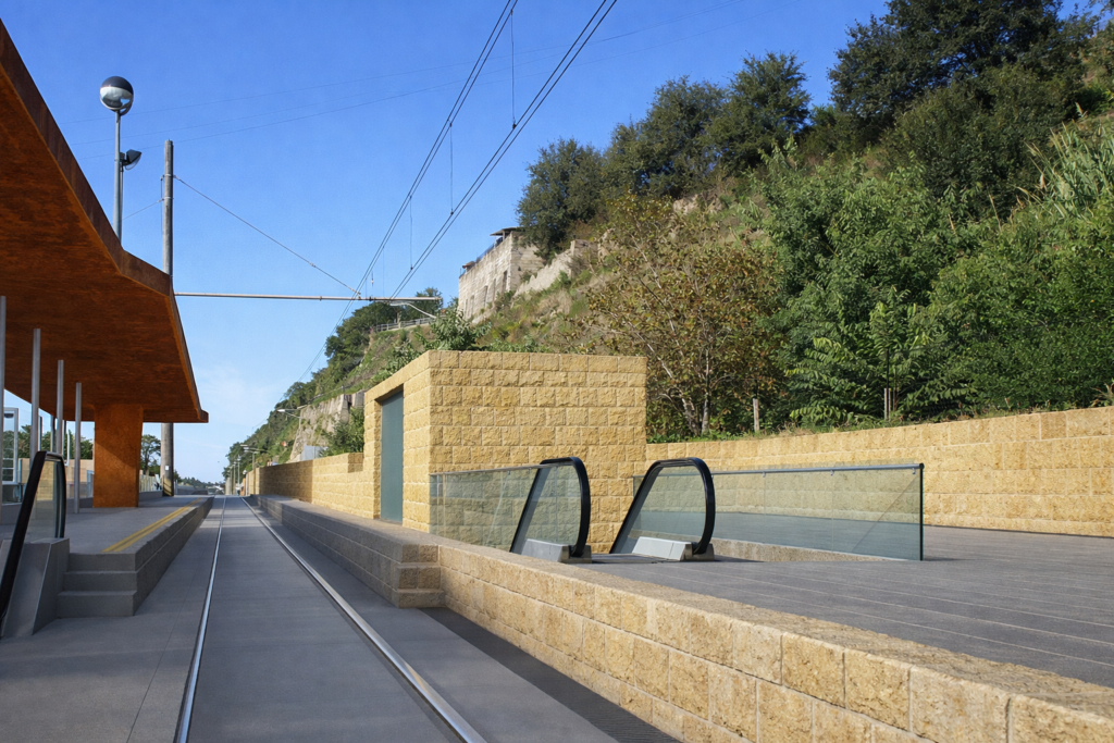 Allo stesso tempo, la tonalità del corten si armonizza con i colori naturali della vegetazione che caratterizza il costone tufaceo. Il piccolo volume tecnico è concepito come un elemento quasi invisibile, ricoperto di terra e realizzato con materiali coerenti con il contesto naturale. L’intento è quello di evocare un intervento scavato nel suolo e successivamente ricomposto, mitigando l’impatto del muraglione di contenimento in cemento armato. Un ulteriore elemento progettuale riguarda il muro esterno lungo via Fasano. In continuità con la struttura esistente, il progetto ne prevede il completamento e una finitura in tufo, materiale tradizionale che rafforza il dialogo con il paesaggio locale. L’accesso alla stazione è definito da un varco strombato sia in pianta sia in alzato, progettato per ridurre la percezione di cesura pur mantenendo una chiara riconoscibilità. Nel complesso, l’intervento non mira a imporsi sul contesto, ma a integrarsi con esso, utilizzando geometrie e materiali come strumenti di relazione, trasformazione e valorizzazione dei caratteri del luogo.