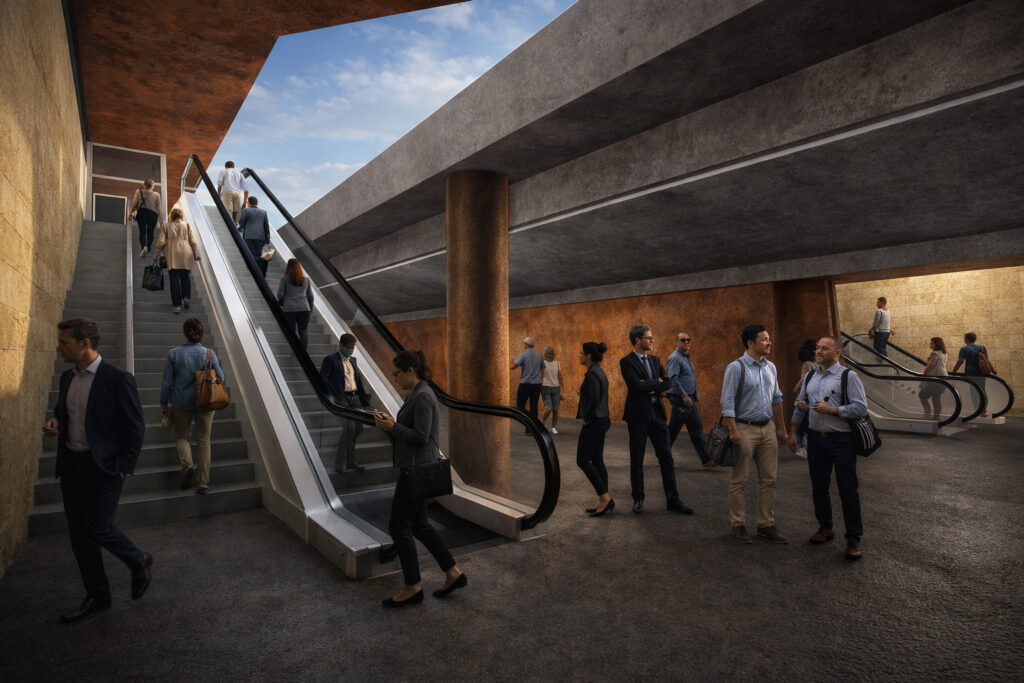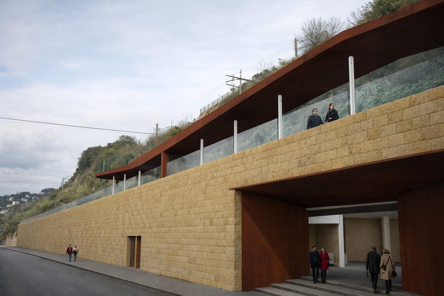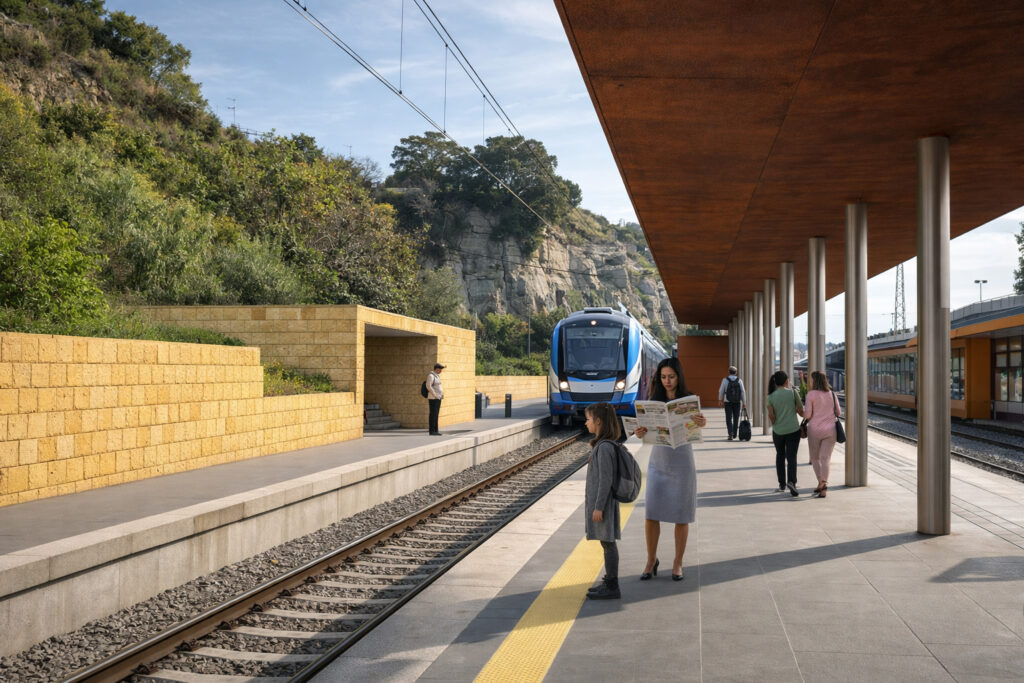 La nuova stazione Cantieri è progettata come un’infrastruttura completamente interrata, sviluppata al di sotto della linea ferroviaria. Questa scelta consente di limitare l’impatto visivo dell’intervento e di preservare la continuità del paesaggio esistente. L’inserimento del nuovo manufatto, in sostituzione dell’attuale struttura in cemento armato, è stato attentamente valutato in relazione agli aspetti percettivi, alla visibilità dai principali punti panoramici e alla trasformazione dell’assetto scenico del contesto. Il progetto si fonda su criteri di compatibilità paesaggistica, sia per quanto riguarda la configurazione volumetrica sia per la selezione dei materiali. In questa prospettiva, la pensilina assume un ruolo centrale: il suo andamento longitudinale è caratterizzato da leggere variazioni di pendenza che evitano una percezione rigida e compatta dell’insieme. Questa soluzione genera un sistema più dinamico, articolato e visivamente leggero, capace di inserirsi con discrezione nel paesaggio. La leggerezza dell’impianto è ulteriormente enfatizzata dalla progressiva rastremazione della sezione strutturale, che contribuisce a ridurre l’impatto visivo dell’opera. Anche la scelta dei materiali partecipa a questa logica di integrazione: il rivestimento in acciaio corten della pensilina stabilisce un legame simbolico con la memoria industriale del luogo, richiamando in particolare la presenza storica della Sofer, per lungo tempo elemento identitario del territorio.